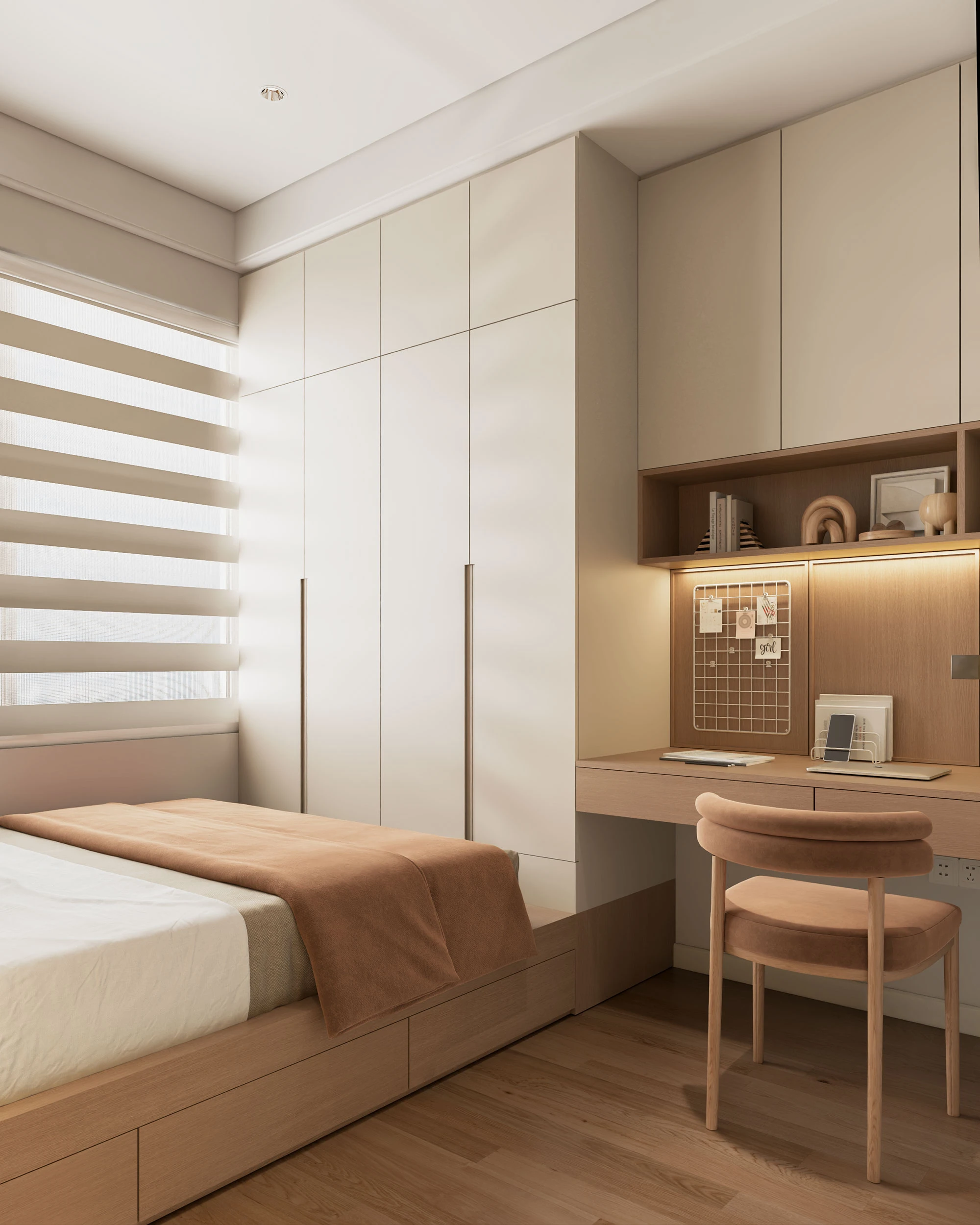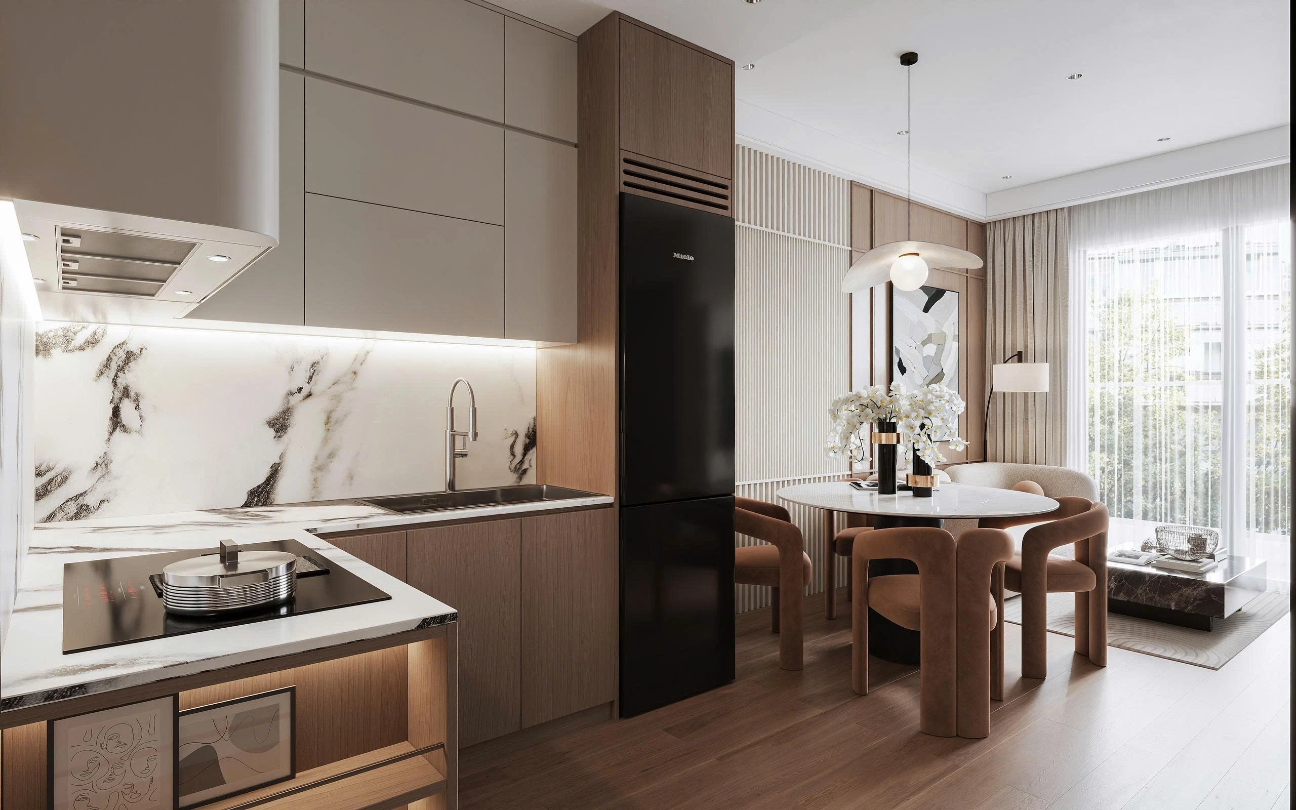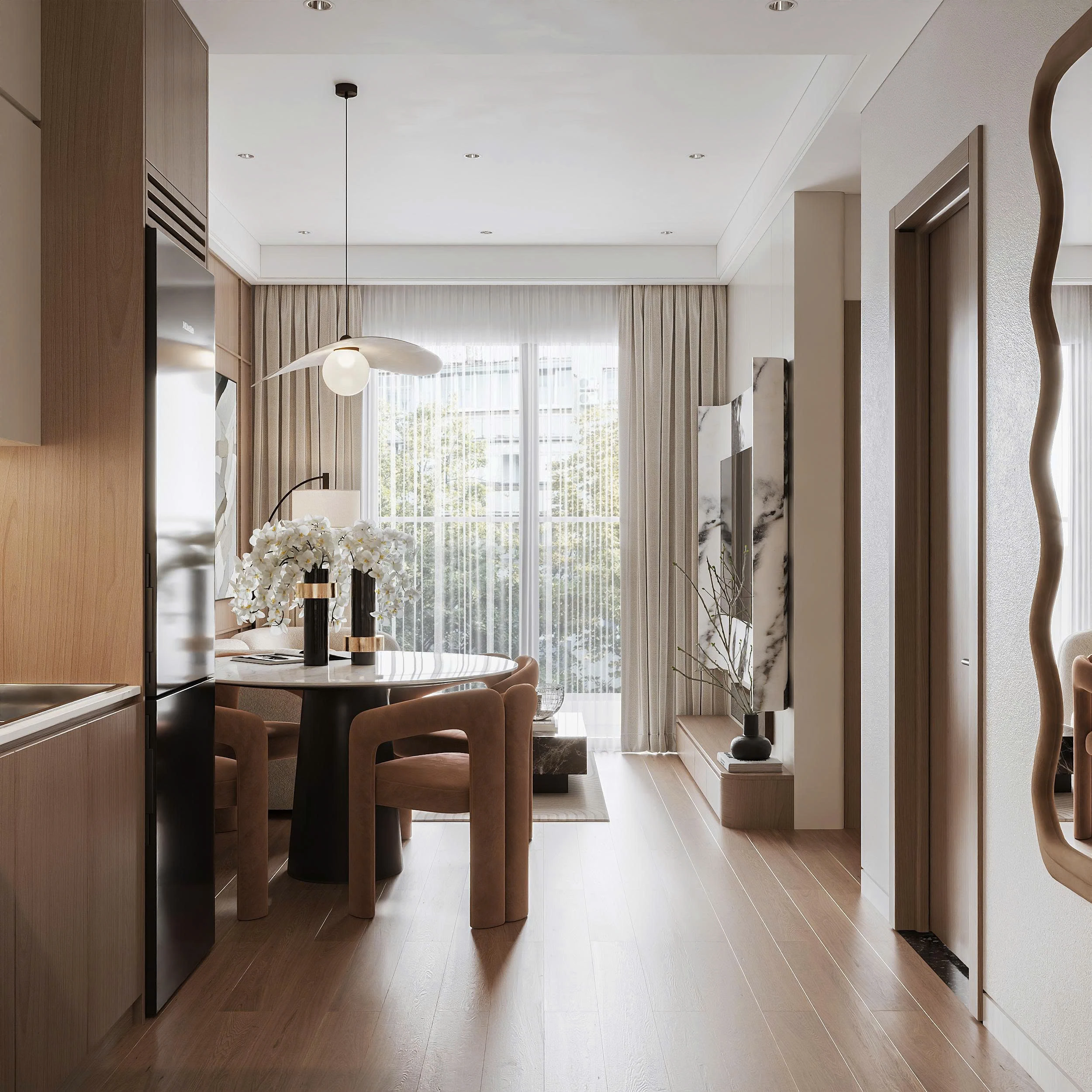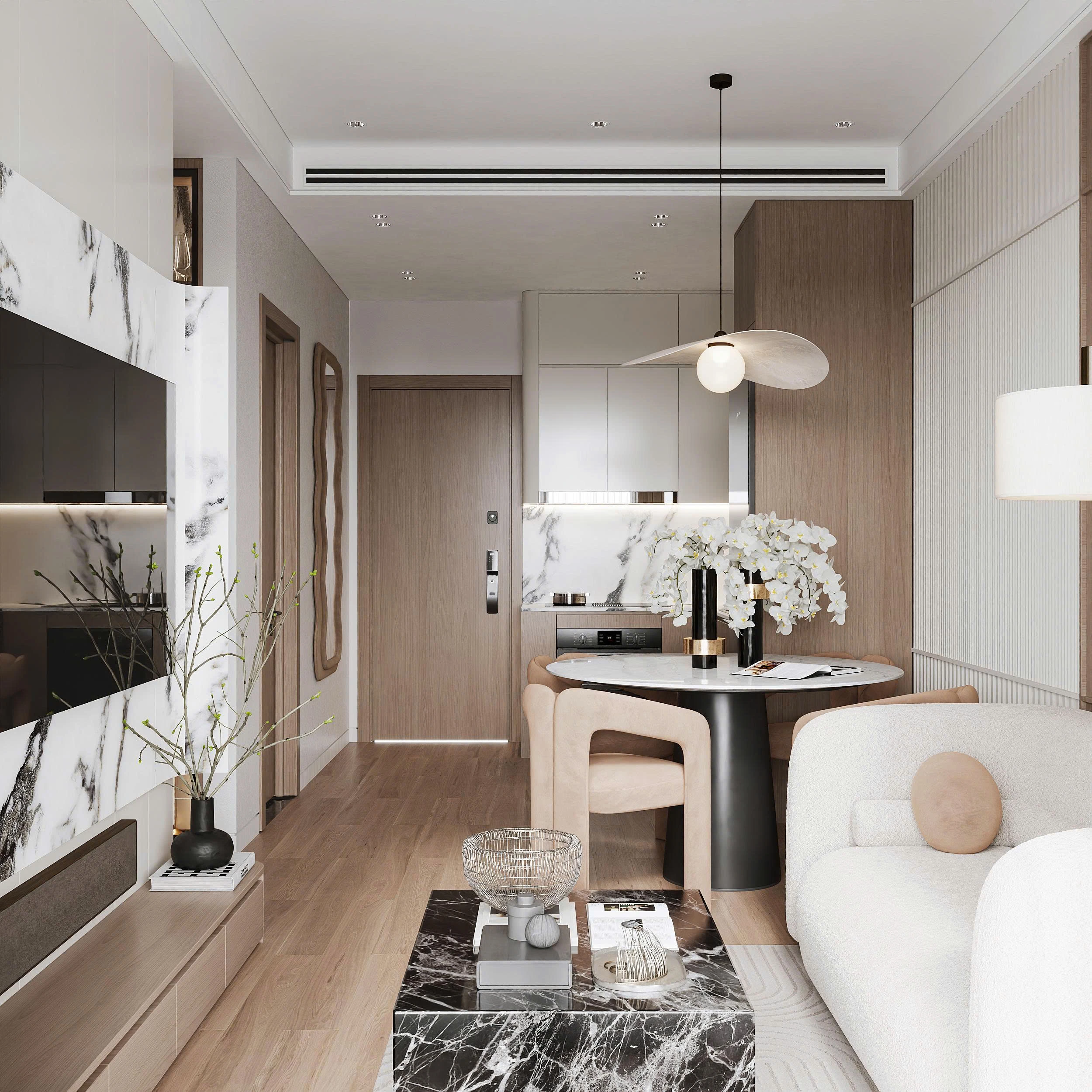 The Ori Phương Mai mở ra khoảng thở an yên – nơi Wabi-Sabi mộc mạc hòa quyện cùng nét hiện đại tinh gọn. Tông gỗ ấm áp, gam màu trung tính và ánh sáng kính mờ tạo nên không gian gần gũi điểm xuyết thêm sắc vàng đồng sang trọng. Căn hộ được “gấp” nên từ từng chi tiết nhỏ giàu cảm xúc, mở ra khởi đầu mới nơi các gia đình nhỏ kiến tạo tổ ấm vững bền.